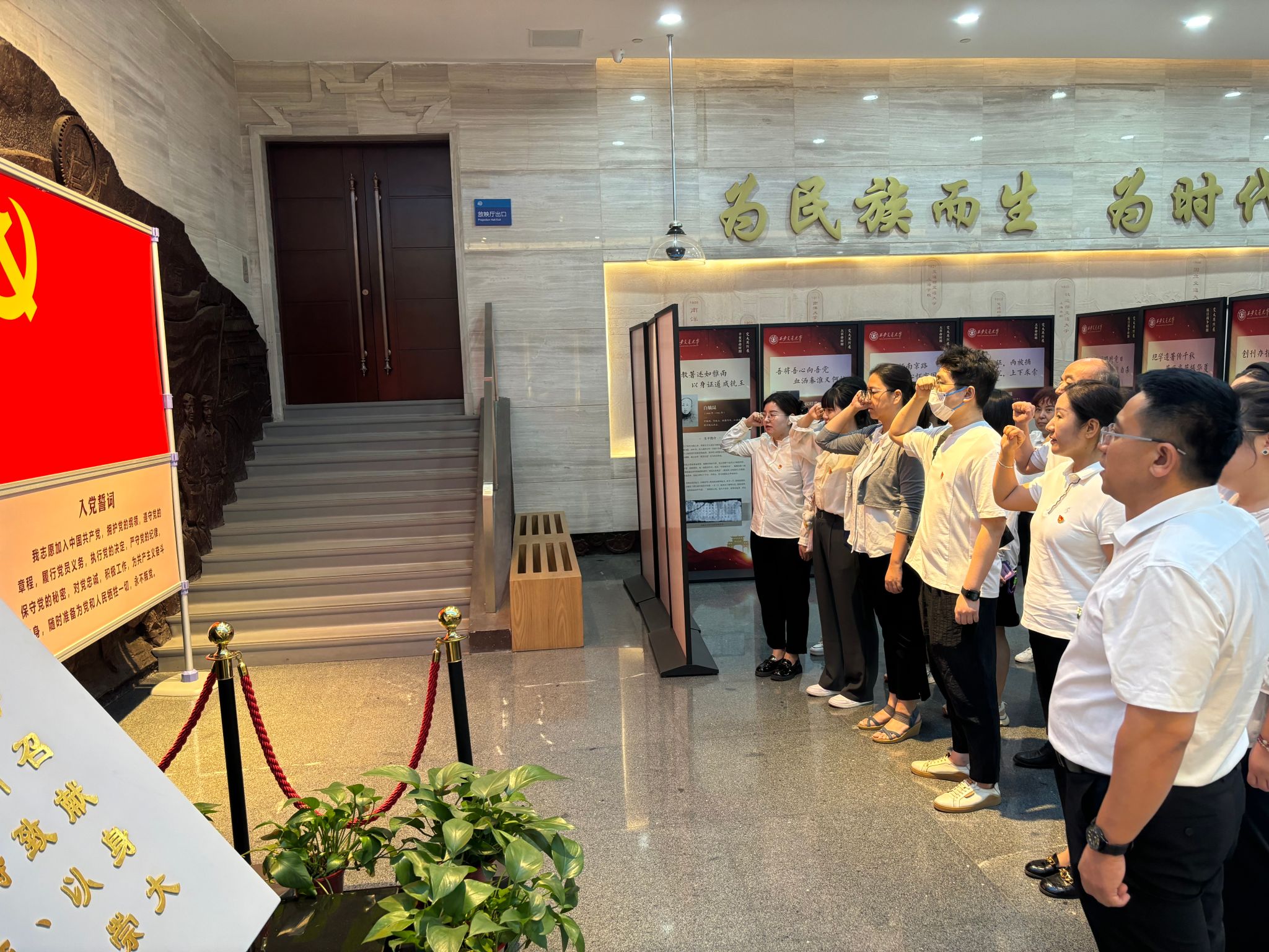 进入博物馆,首先,组织委员梁鹏带领党员教师面向党旗庄严宣誓,重温入党誓词,用铮铮誓言表达了弘扬西迁精神、汲取奋斗力量、牢记责任担当的信心和决心。