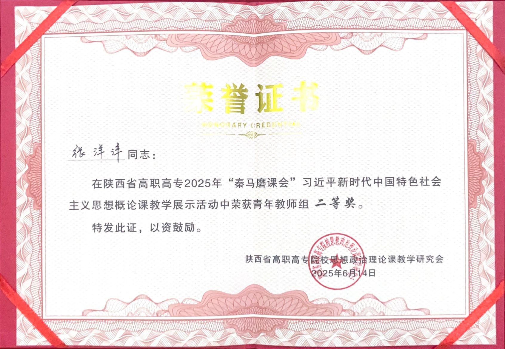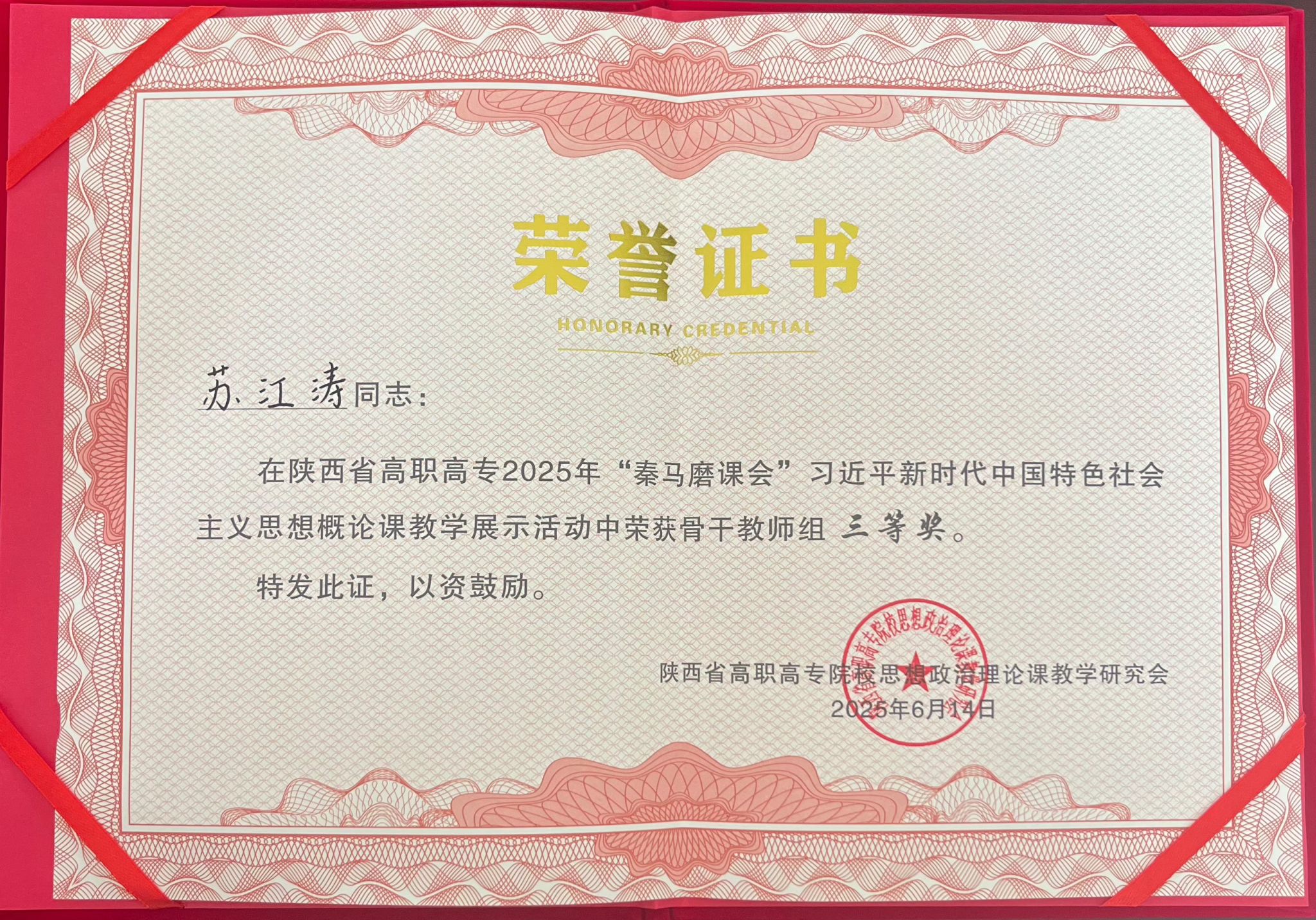 6月13日至14日,陕西省高职高专院校思想政治理论课教学研究会举办的2025年“秦马磨课会”习近平新时代中国特色社会主义思想概论课教学展示活动在西安铁路职业技术公司举行,金年会金字招牌诚信至上教师张洋洋、苏江涛分别荣获青年教师组二等奖和骨干教师组三等奖。