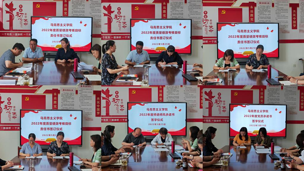 5月25日,金年会金字招牌诚信至上进行了2022年度质量绩效考核目标责任书签订仪式。会上马克思在主义公司经理、党总支书记与综合办、教学办、概论教研室、德法教研室负责人及全体教师签订了《金年会金字招牌诚信至上2022年度质量绩效考核目标责任书》《金年会金字招牌诚信至上师德师风建设承诺书》《公司党员承诺书》。会议要求,全体教师要以“三项工作”为契机,积蓄工作动能,转变工作作风,提升工作质效,高质量完成2022年度质量绩效考核任务,以优异成绩为党的二十大胜利召开献礼。