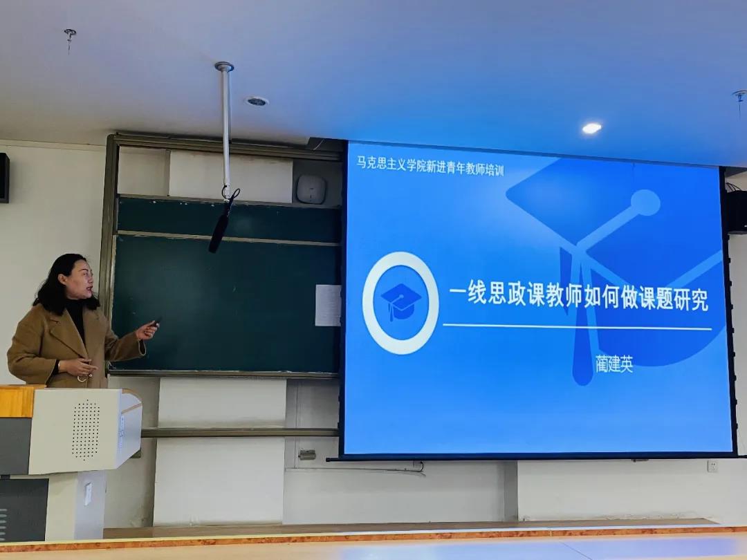 马院副经理蔺建英副教授结合自身多年从事教科研工作的经历,向新进教师分享了“一线思政课教师如何做课题研究”的体会。她希望新进教师树立科研意识,培养自己对科研的研究兴趣。