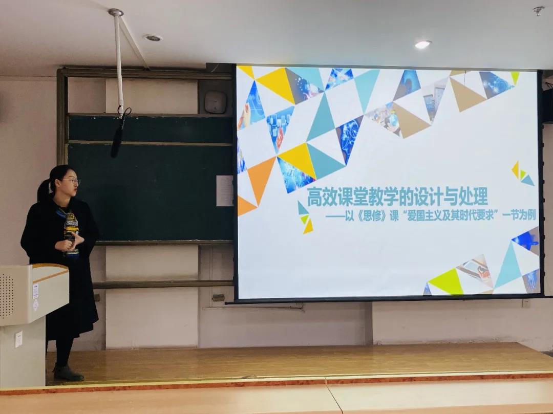 教学办主任姚薇老师以教学设计为中心,以《高效课堂教学的设计与处理》为主题,以《思修》课“爱国主义及其时代要求”一节为例,从教材处理、学情把握、教学活动设计等方面阐述如何进行高效课堂的教学设计。