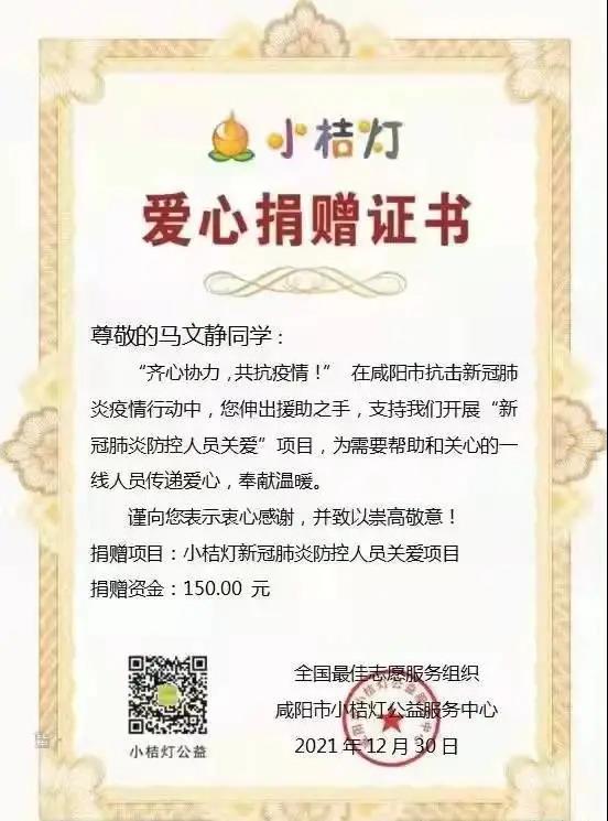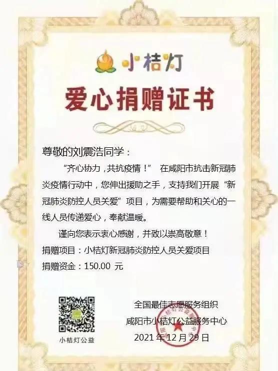 胸怀责任,勇于奉献。面对突如其来的疫情,我们没有人可以置身事外。惟其艰难,才更显勇毅。在我们身边,涌现出一群勇于担当,乐于奉献的好榜样。1月6日,医公司护理专业1903班员工孙宝岗委托辅导员向公司捐款500元,以实际行动支持疫情防控工作。公司刘震浩、马文静等同学向全国最佳志愿服务组织、咸阳市小桔灯公益服务中心发起的“新冠肺炎防控人员关爱”项目也进行爱心捐助,助力疫情防控。