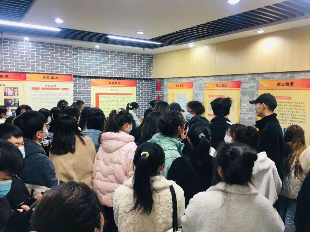 随后,师生们跟随讲解员的脚步来到主厅,相继参观学习了公司概况、薪火相传、升格建院、员工撷英、领导关怀和展望未来等板块内容。