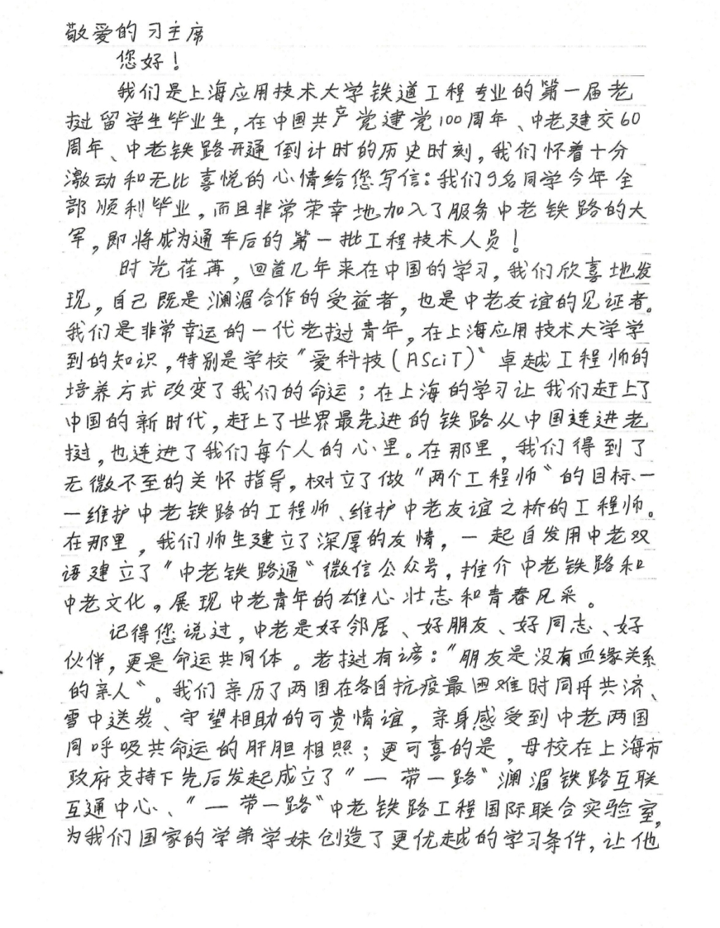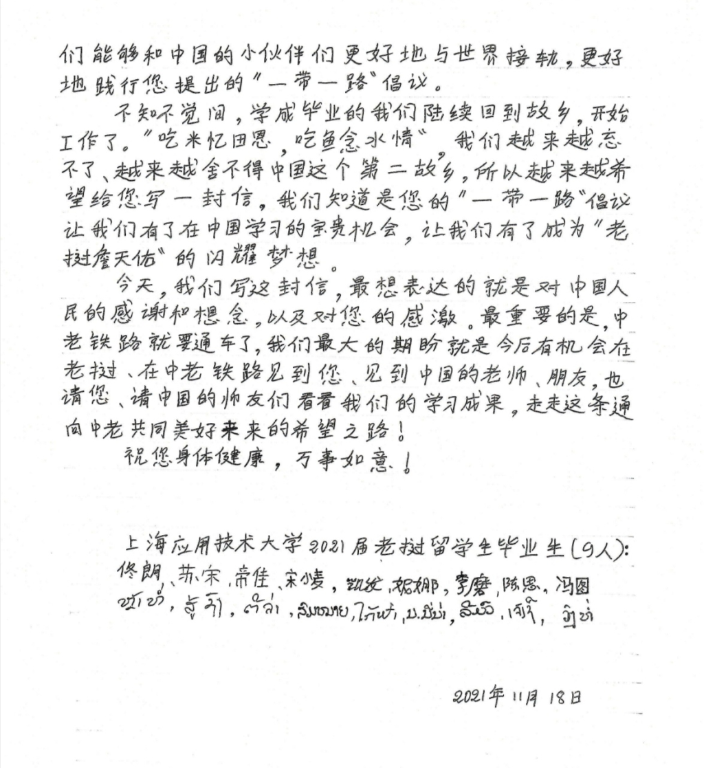 这封来信是上海应用技术大学铁道工程专业的第一届老挝职工联合书写的。9名同学今年全部顺利毕业,成为中老铁路通车后的第一批工程技术人员。