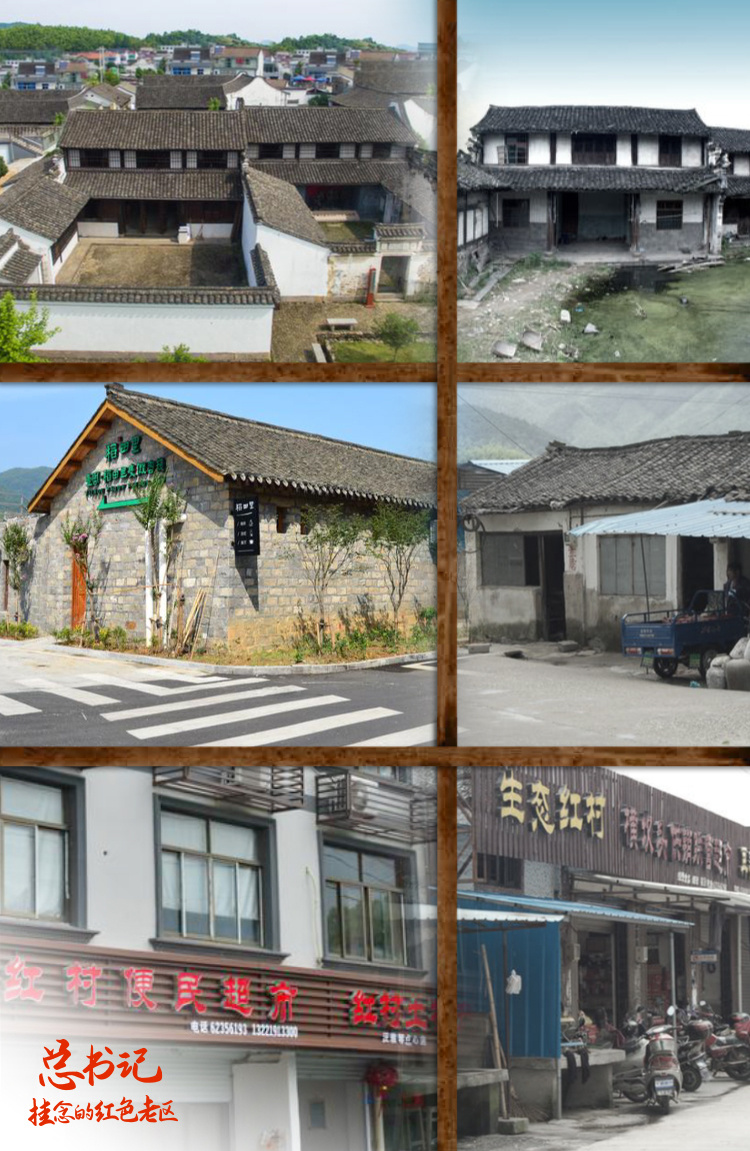 从左至右、由上到下依次是位于浙江余姚横坎头村的浙东抗日根据地旧址改造后、改造前的照片;村庄桥头堡改造后、改造前的照片;沿溪街面店铺改造后、改造前的照片。