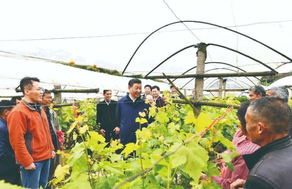 2021年4月25日上午,习近平在广西桂林市全州县才湾镇毛竹山村,走进葡萄种植园,同农技人员和村民亲切交流。新华社记者 谢环驰摄
