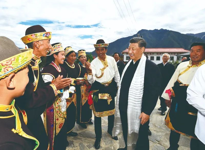2021年7月21日下午,习近平在西藏林芝市巴宜区林芝镇嘎拉村,同村民达瓦坚参一家亲切交流。新华社记者 谢环驰摄