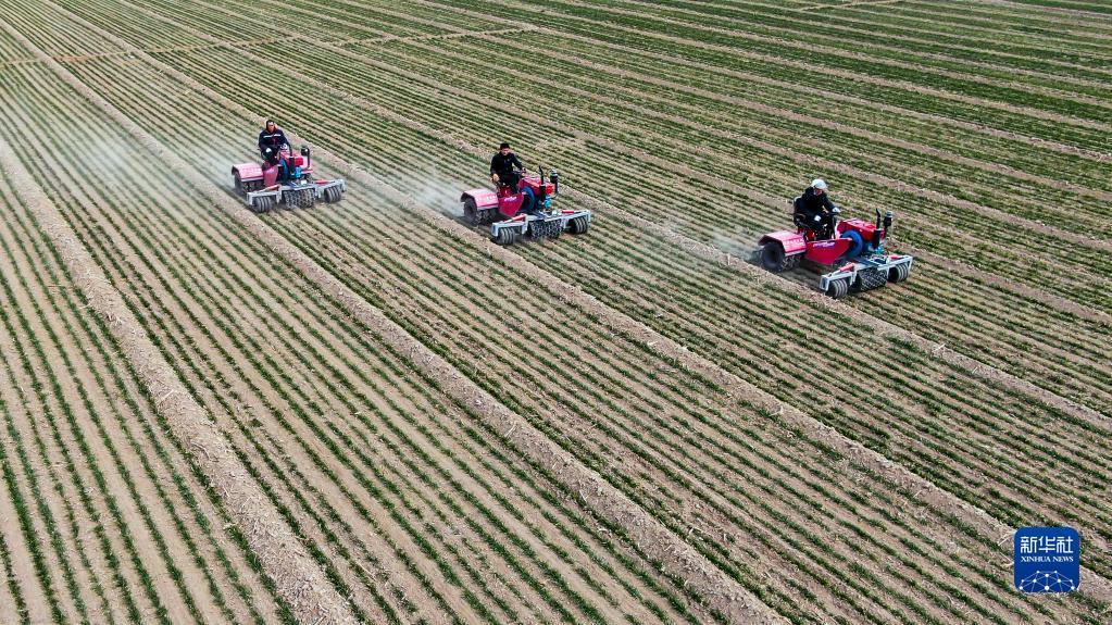 2月17日,在山东省聊城市莘县妹冢镇,农民在麦田里进行镇压保墒作业(无人机照片)。新华社记者 郭绪雷 摄