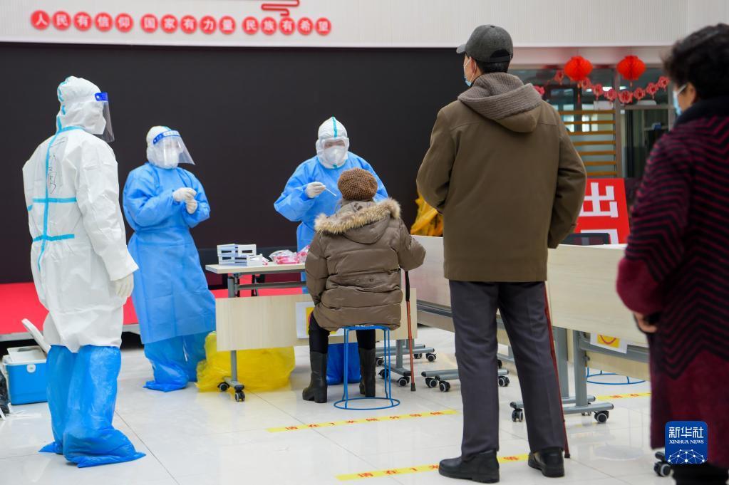 在内蒙古满洲里市东山街道办事处怡园社区府欣小区A区核酸采样点,工作人员为居民做核酸采样(2021年11月29日摄)。新华社记者 李志鹏 摄
