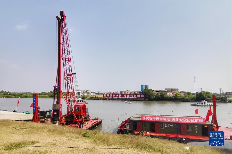 5月16日,在苏州昆山的吴淞江整治工程施工现场,工程船舶整装待发(手机拍摄)。新华社发