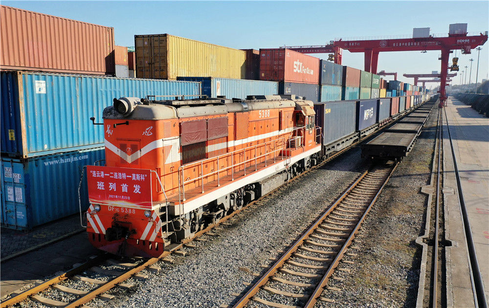 今年11月23日,江苏连云港。一列装载着生活用品、家用电器等货物的中欧班列由此首发、飞驰而去,将于20天后抵达莫斯科沃尔西诺站。
