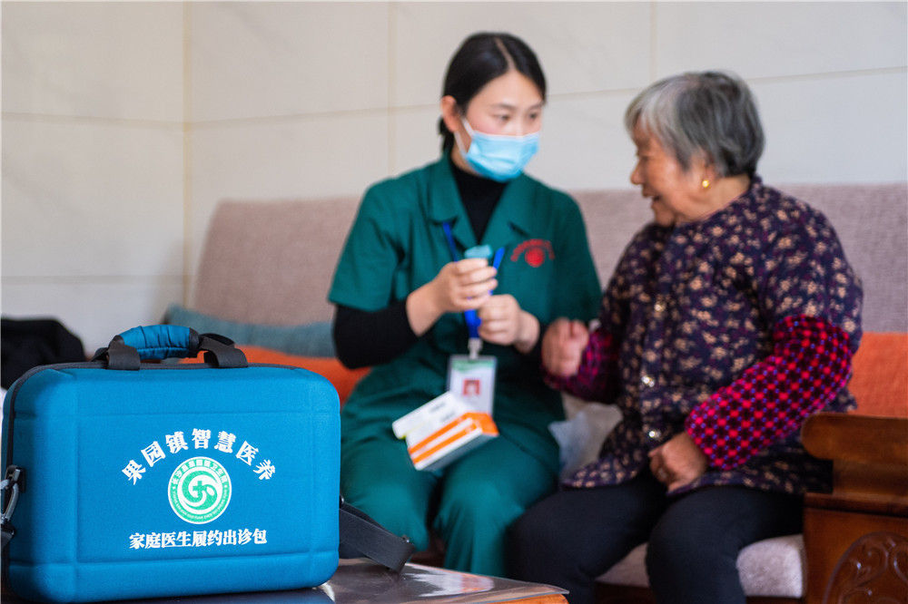 11月12日,在湖南省长沙市长沙县果园镇杨泗庙社区,医务人员刘敏指导居家老人用药。新华社记者 陈思汗 摄