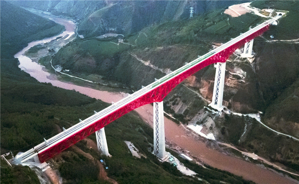 中老铁路首发列车驶过中国云南省元江哈尼族彝族傣族自治县境内的元江双线特大桥(12月3日摄,无人机照片)。新华社记者 王冠森 摄
