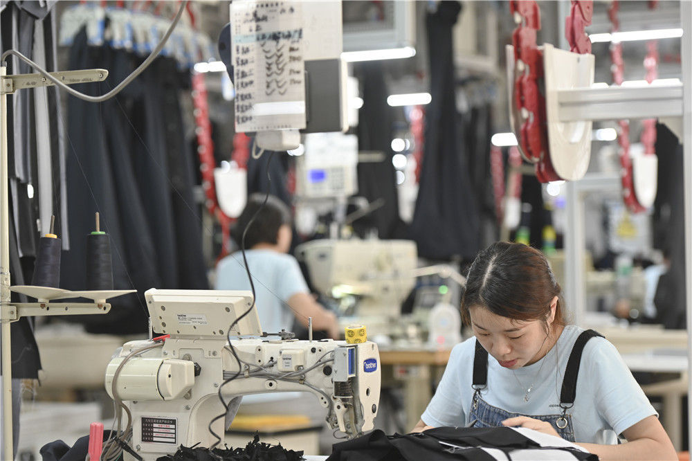 在位于福建省泉州市经济技术开发区的九牧王西裤智能化生产车间,工人在自动化西裤吊挂流水线上作业(7月30日摄)。新华社记者 宋为伟 摄