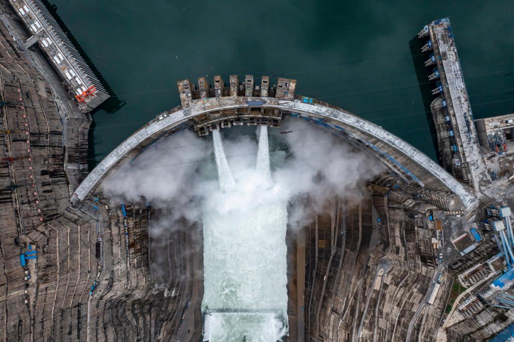 这是2021年6月10日拍摄的金沙江白鹤滩水电站。白鹤滩水电站是实施“西电东送”的国家重大工程,是当今世界在建规模最大、技术难度最高的水电工程(无人机照片)。新华社记者 胥冰洁 摄