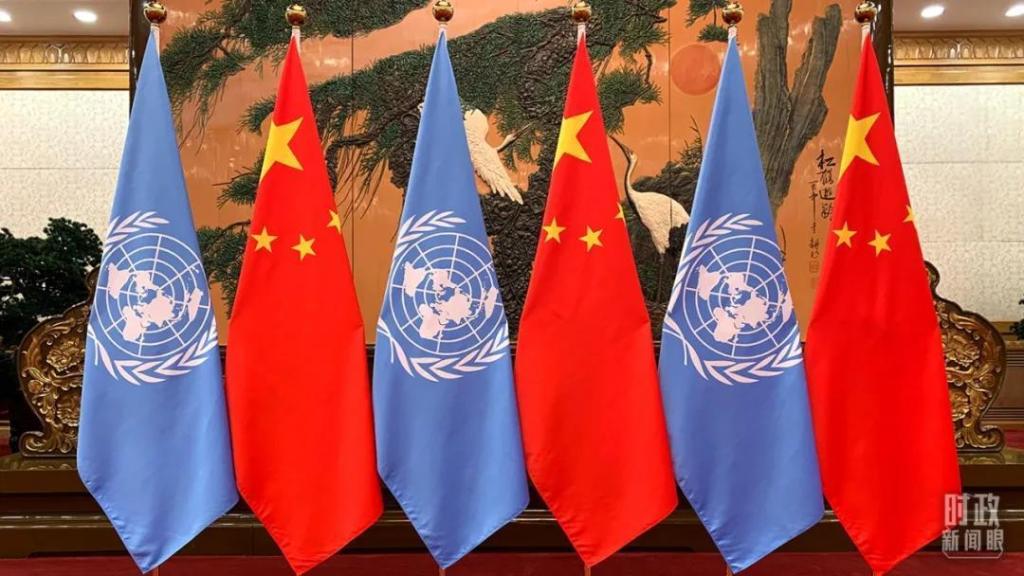 会谈现场的联合国旗帜与五星红旗。(总台央视记者段德文拍摄)